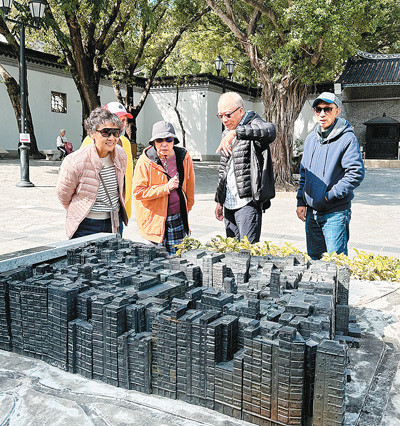 九龙寨城公园内,仿照昔日城寨建筑物制造而成的铜铸模型吸引不少市民驻足欣赏。 本报记者 陈 然摄